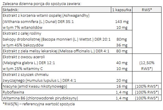 Składniki: ekstrakt z korzenia witanii ospałej (Ashwagandhy) (Withania somnifera (L.) Dunal) DER 35:1 w tym 7% witanolidów; substancja wypełniająca: celuloza; kapsułka (żelatyna, barwnik: węglan wapnia); ekstrakt z całej rośliny bakopy drobnolistnej (Bacopa monnieri (L.) Wettst.) DER 20:1 w tym 45% bakozydów; ekstrakt z ziela melisy lekarskiej (Melissa officinalis L.) DER 4:1; ekstrakt z owocu aceroli (Malpighia glabra L.) DER 12:1 w tym 25% witaminy C; ekstrakt z szyszek chmielu zwyczajnego (Humulus lupulus L.) DER 4:1; niacyna (amid kwasu nikotynowego); substancje przeciwzbrylające: sole magnezowe kwasów tłuszczowych, dwutlenek krzemu; witamina B6 (chlorowodorek pirydoksyny); ryboflawina.